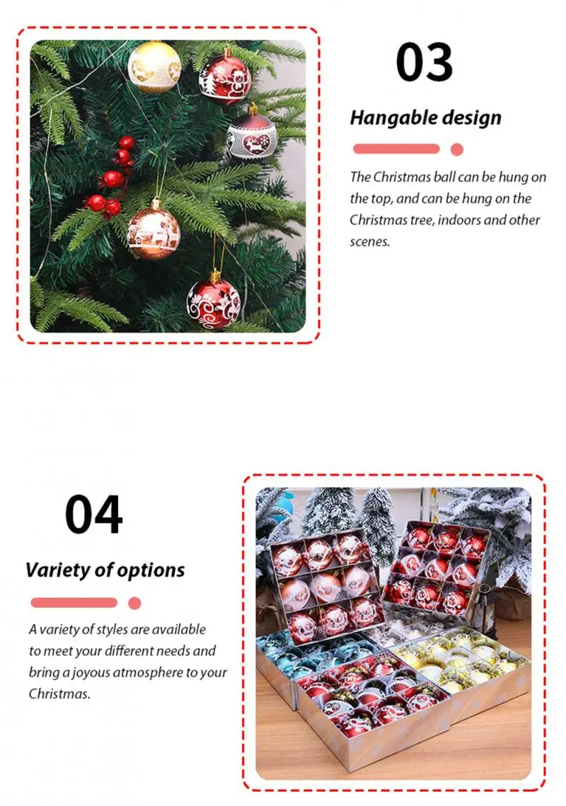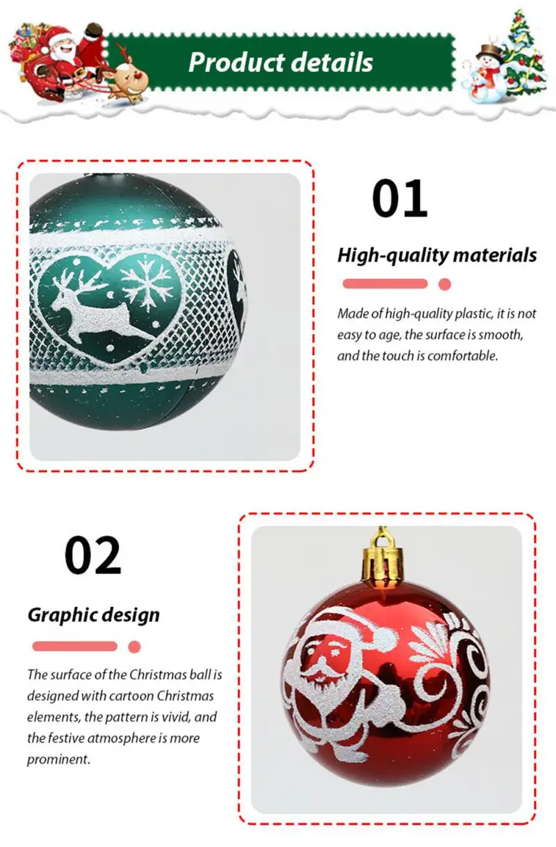 Рождественский шар изготовлен из пластикового материала, усовершенствованной технологии гальванического покрытия и сверхплотной упаковочной коробки. Он более прочный во время длительной транспортировки и подвески. Сверхплотная упаковочная коробка предотвращает поломку мяча во время транспортировки.