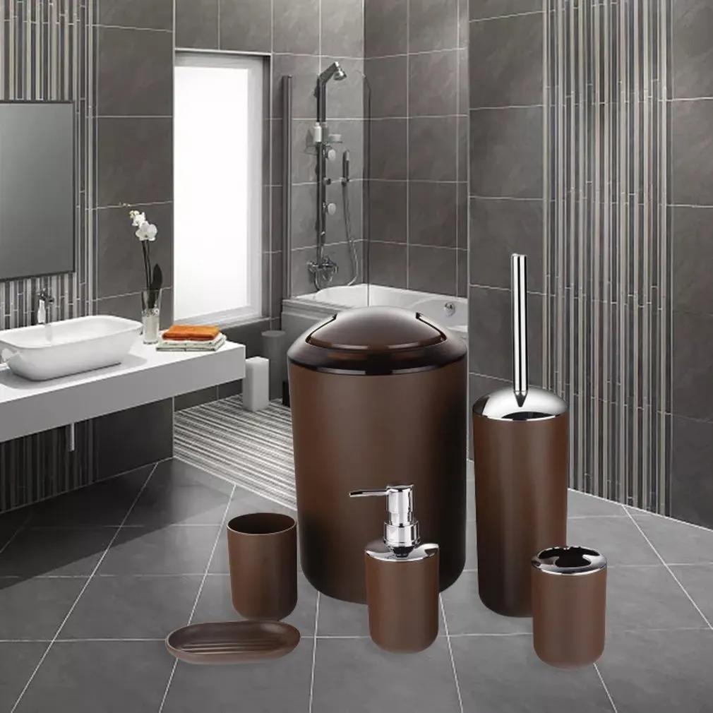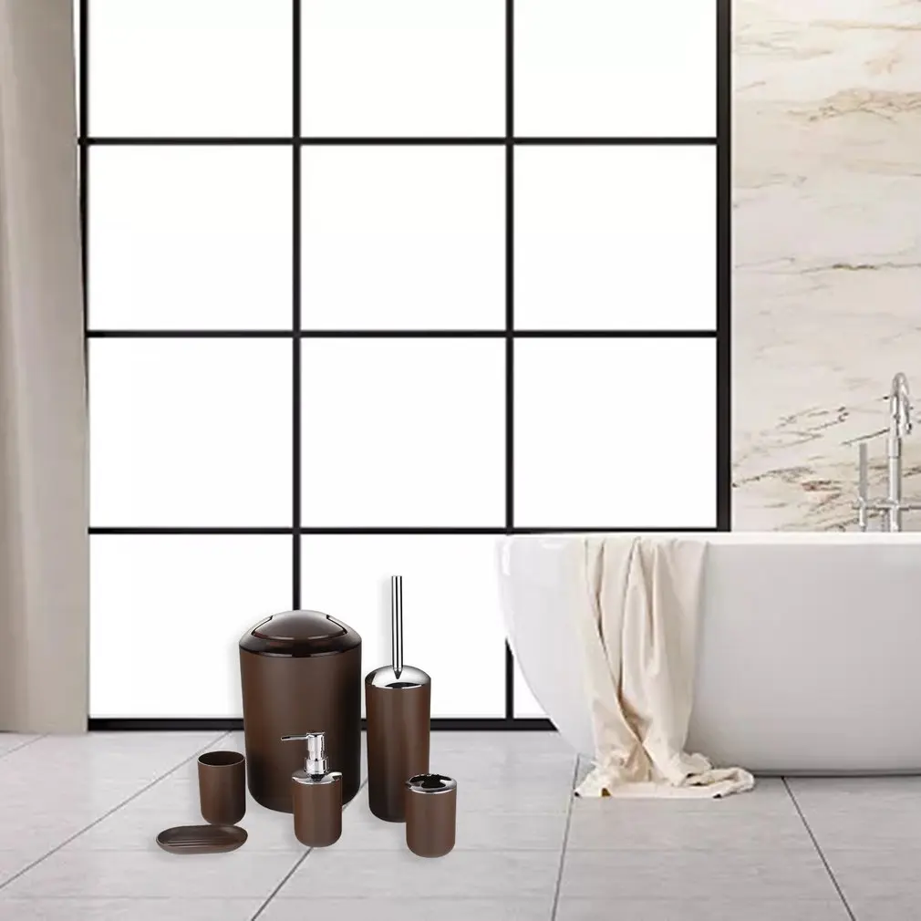 The six-piece bathroom set is equipped with a lotion dispenser, toothbrush holder, glass cup, soap box, trash can and toilet brush.