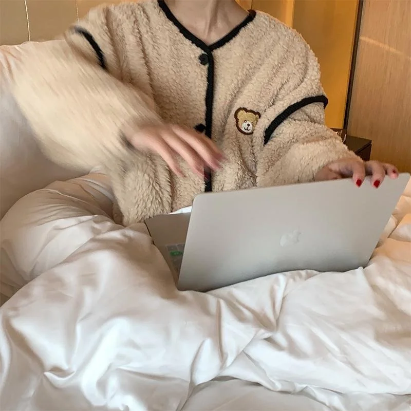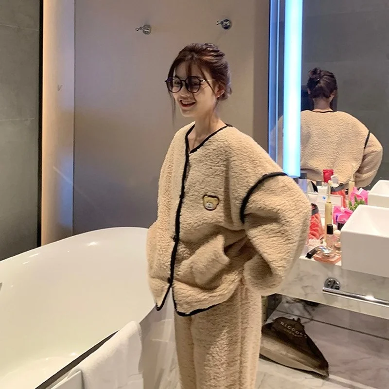 Отзывы о QWEEK/женские зимние пижамы Kawaii Bear Пижамы с вышивкой Пуговицы V-образный вырез