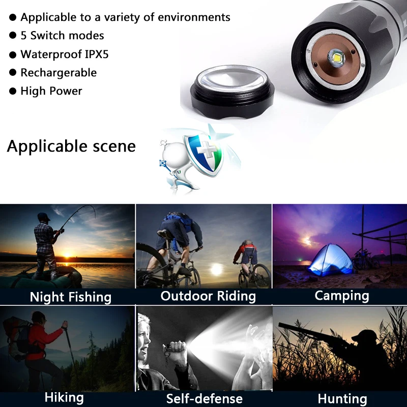 Бренд: CeholydМодель: CH07Светильник источник: XHP50Цвет внешнего вида: черный5-скоростной режим: 100%-50% флеш-накопителейРазмер: 160 мм × 40 мм × 34 ммМощность: 1x26650 аккумулятор или 1x18650 аккумуляторВремя освещения: аккумулятор 18650 3-6 часов; Аккумулятор 26650: 6-12 часовМетод зарядки: Micro USB Прямая зарядкаДиапазон: от 200 до 500 метровЗум: зум-объектив (увеличение/уменьшение ЗумаВодонепроницаемость: IPX4Вес: 210 гМатериал: T6063-T6 авиационный алюминийИспользование: семья, охота, патрулирование, строительство, ходьба, техническое обслуживание, поиск и спасение