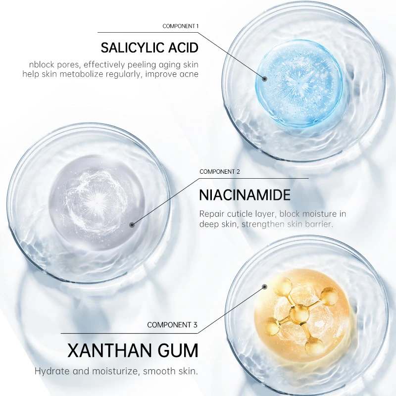 Прыщи можно разделить на черные и белые. Когда кожное сало не может регулярно удаляться из кожи, оно будет скапливаться на поверхности и таким образом образует черную головку и белую головку. Аалициловая кислота может разблокировать поры и контролировать масло, в то время как она может удалить старение кутикулы и улучшить акне, потому что с растворимостью жира, она может лучше действовать на фолликулах, чем гидрокси-кислота, которая является водорастворимой.