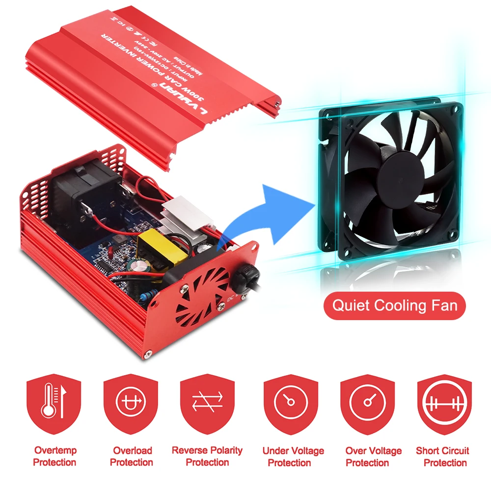 -Защита: перегрузка, короткое замыкание, перегрев, обратная полярность, под/над напряжением, Охлаждающие вентиляторы