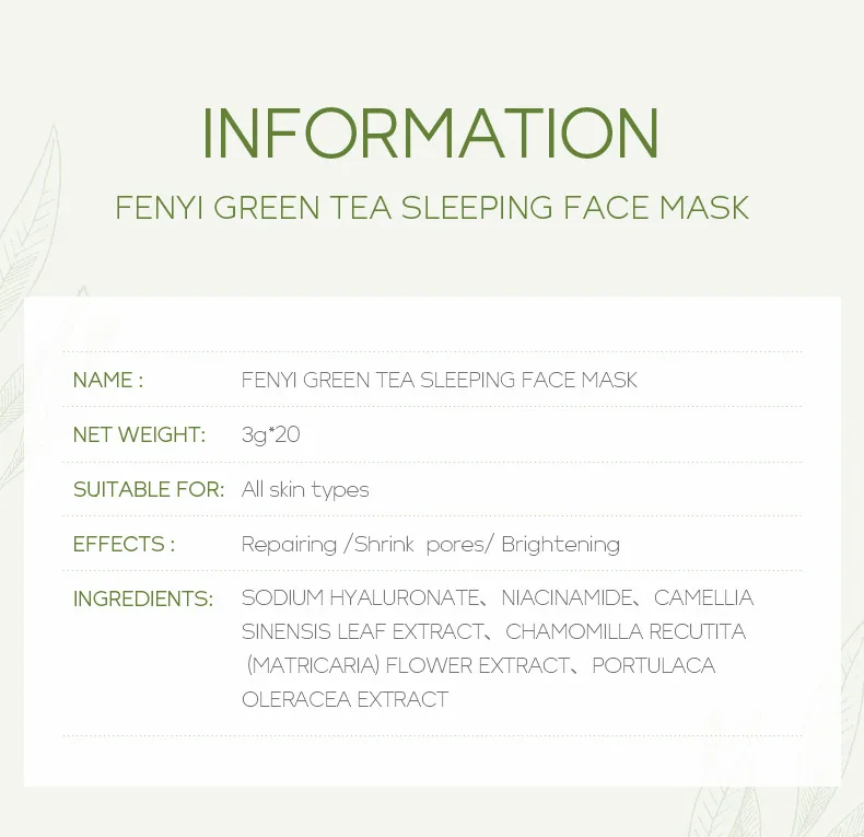 Богатый экстрактами сакуры, эссенцией водорослей, гиалуроновой кислотой и другими питательными ингредиентами для интенсивного восстановления и защиты кожи, он может восстановить потерю влаги для вашей кожи во время сна, И пусть ваша кожа увлажняет, хорошо отдыхает и динамична при пробуждении!