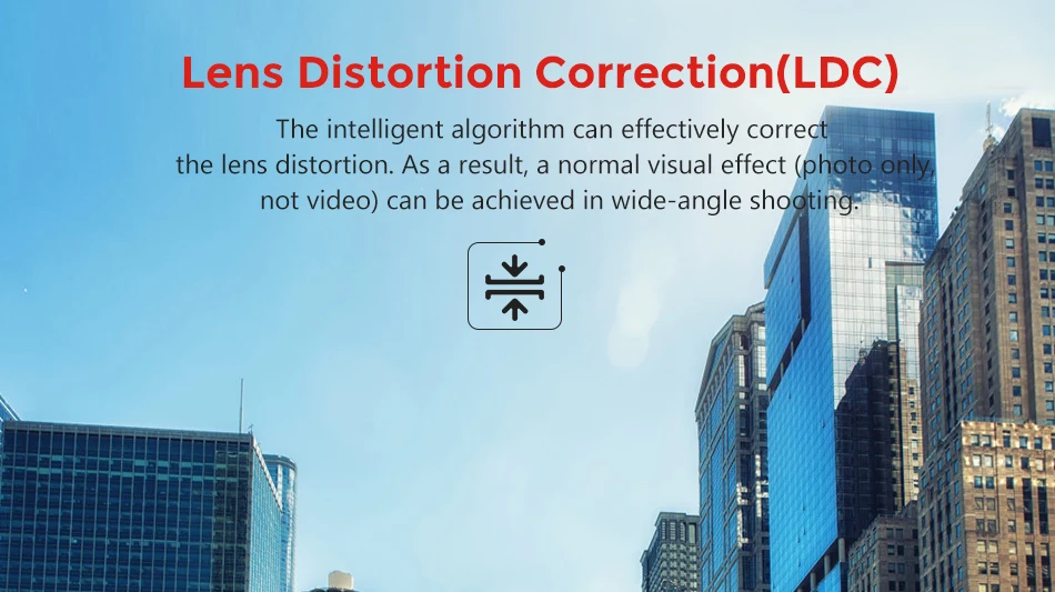 Интеллектуальный алгоритм может эффективно исправить искажение объектива. В результате нормальный визуальный эффект (только фото, а не видео) может быть достигнут при широкоугольной съемке.