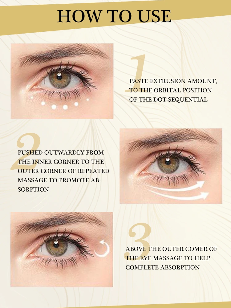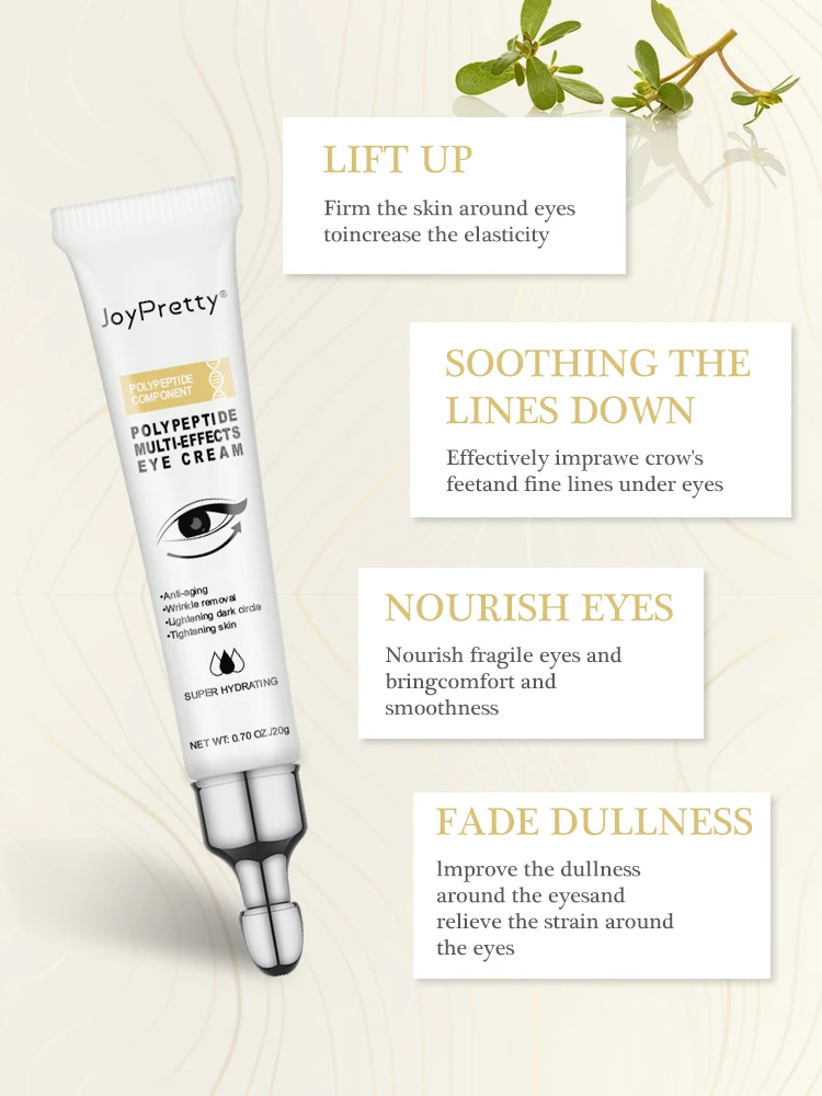 ▶Описание товара: со временем проблемы с кожей вокруг глаз Постепенно появляются. Этот крем для глаз специально добавил полипептидный компонент, который может увлажнить кожу и удалить темный круг и мешок для глаз. Он также может затянуть кожу и укрепить структуру глаз. Улучшение проблем с кожей, вызванных задержкой в работе, продолжительным воспроизведением компьютера, старением и т. д. Обеспечивает всесторонний уход за кожей с утра до ночи.