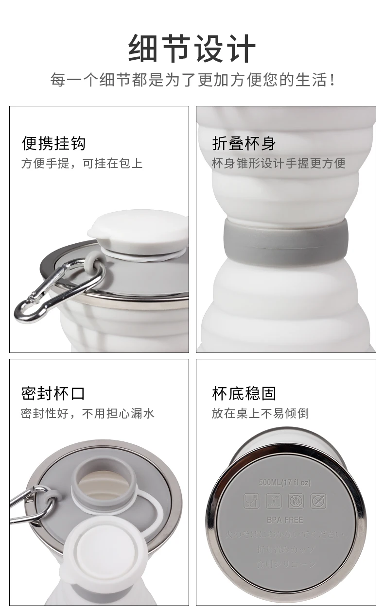 3. Теплостойкость и долговечность-наша Складная Питьевая чашка может выдерживать температурный диапазон от-40 ℃ до 240 ℃, чрезвычайно термостойкая и морозостойкая, подходит для холодных напитков, чая, кофе и горячих напитков. Безопасная Посудомоечная машина и морозильная камера.