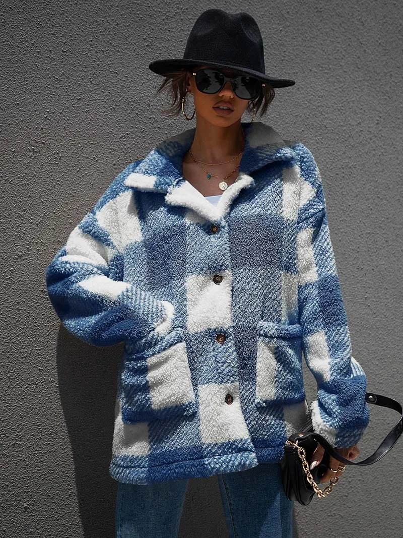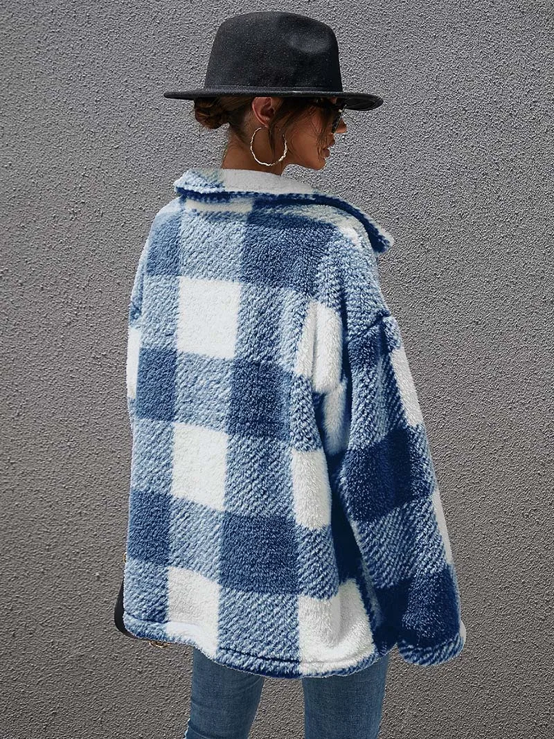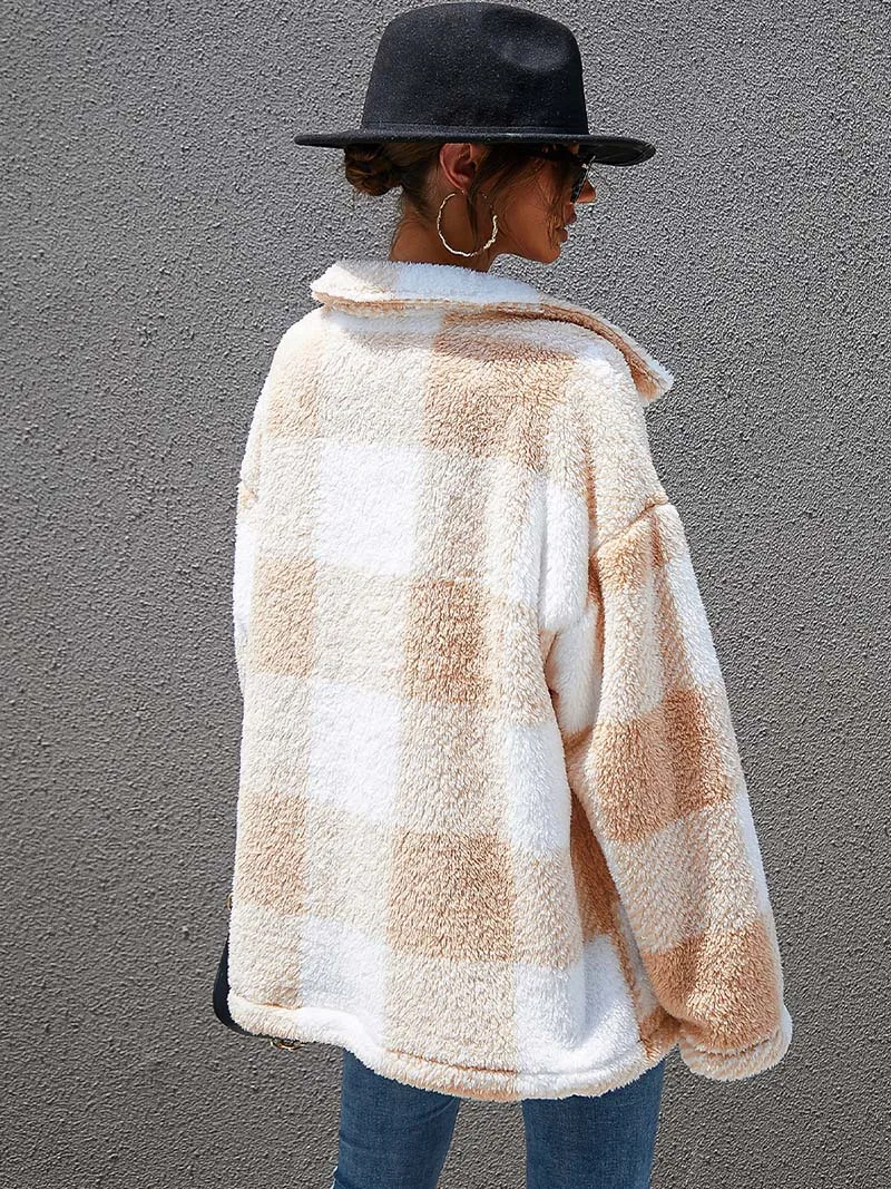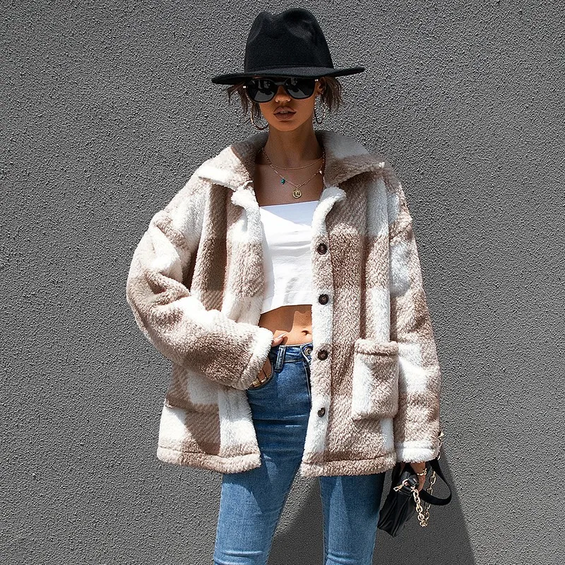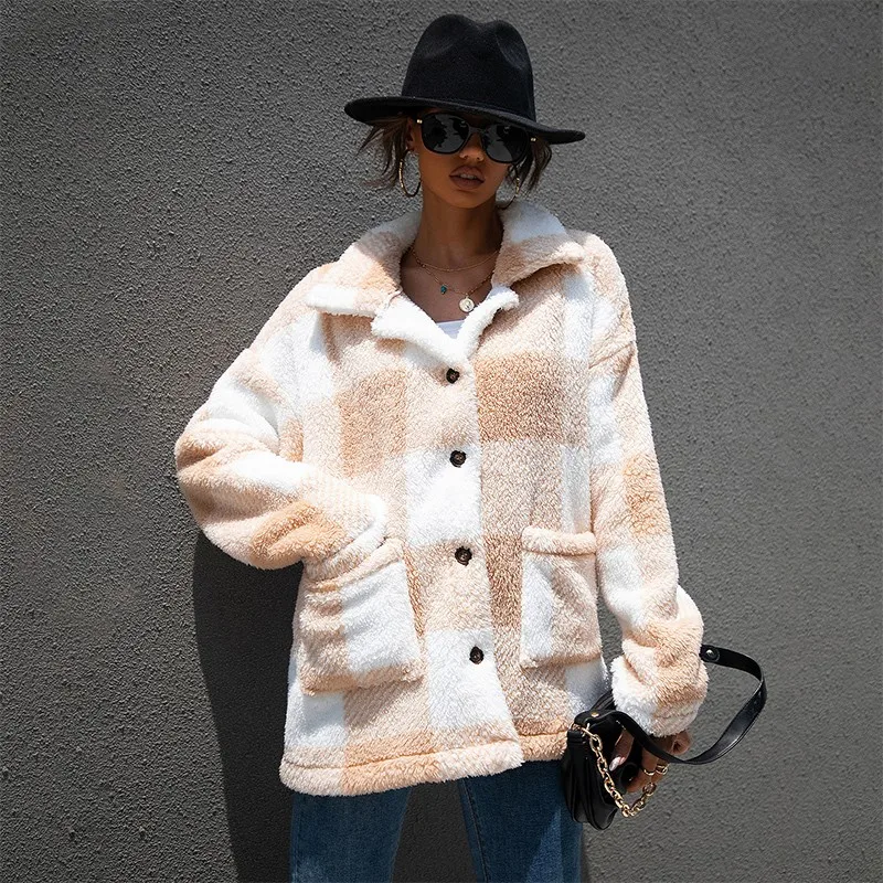 Зимнее теплое пальто из искусственного меха, женская одежда, модная клетчатая флисовая мягкая плюшевая Дамская куртка, пальто с карманами, Повседневная Свободная верхняя одежда