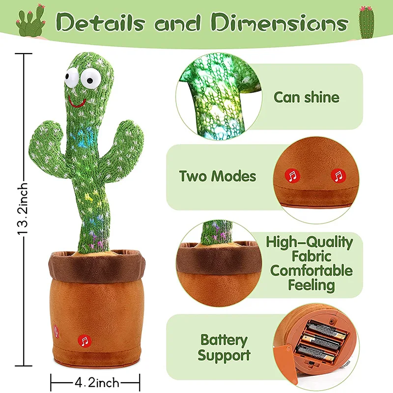 Игрушечный кактус для танца кактуса-подарки для детей или друзей. Эта забавная игрушка обязательно заставит тех, кто действительно смеется! Имитирующая игрушка-кактус может записывать то, что вы говорите, и продолжать играть. Танцующий кактус плюшевые игрушки, детские игрушки для детей 3 месяцев и выше, он может быть использован в качестве украшения комнаты.