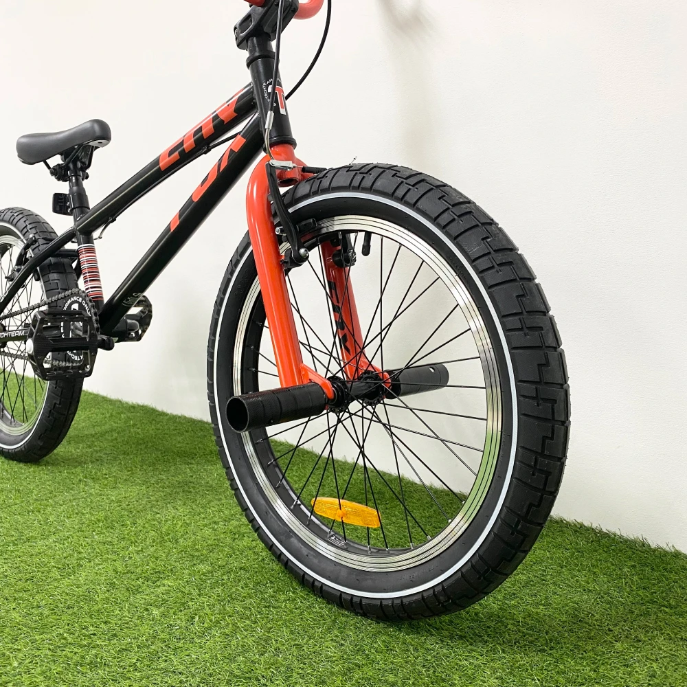 BMX оснащен передним и задним тормозом типа V-brake, трансмиссией из ведущей звезды на 32 "зуба" и задней на 16.