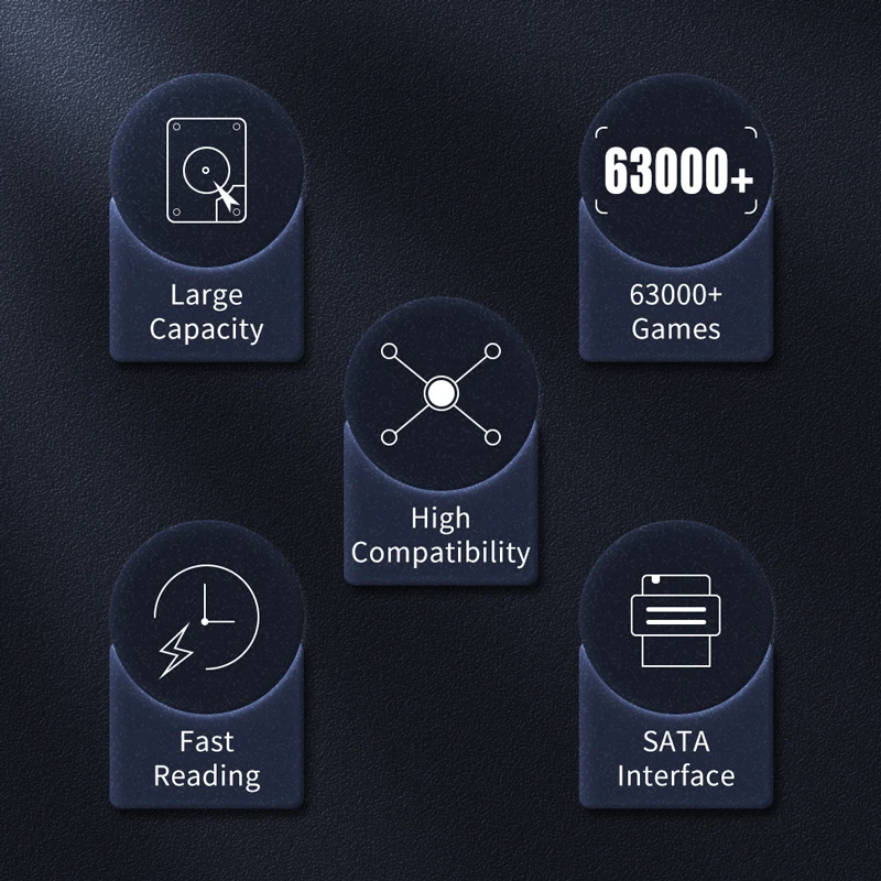 Наш жесткий диск предварительно установлен с 61000 ~ 63000 + играми, включая 400 + PS1 игр, 200 + PS2 игр, 400 + PSP игр, охватывающих 108 игровых коллекций и эмуляторов