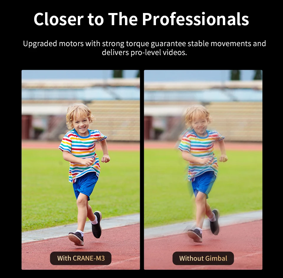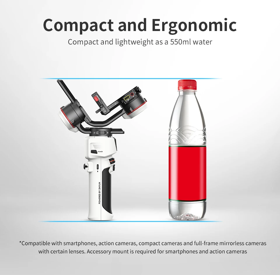 Избавьтесь от высокого тела, Zhiyun Crane M3 такой же крошечный, как бутылка воды. Но модернизированные двигатели с сильным крутящим моментом гарантируют стабильное движение и съемку с камерами разных размеров.