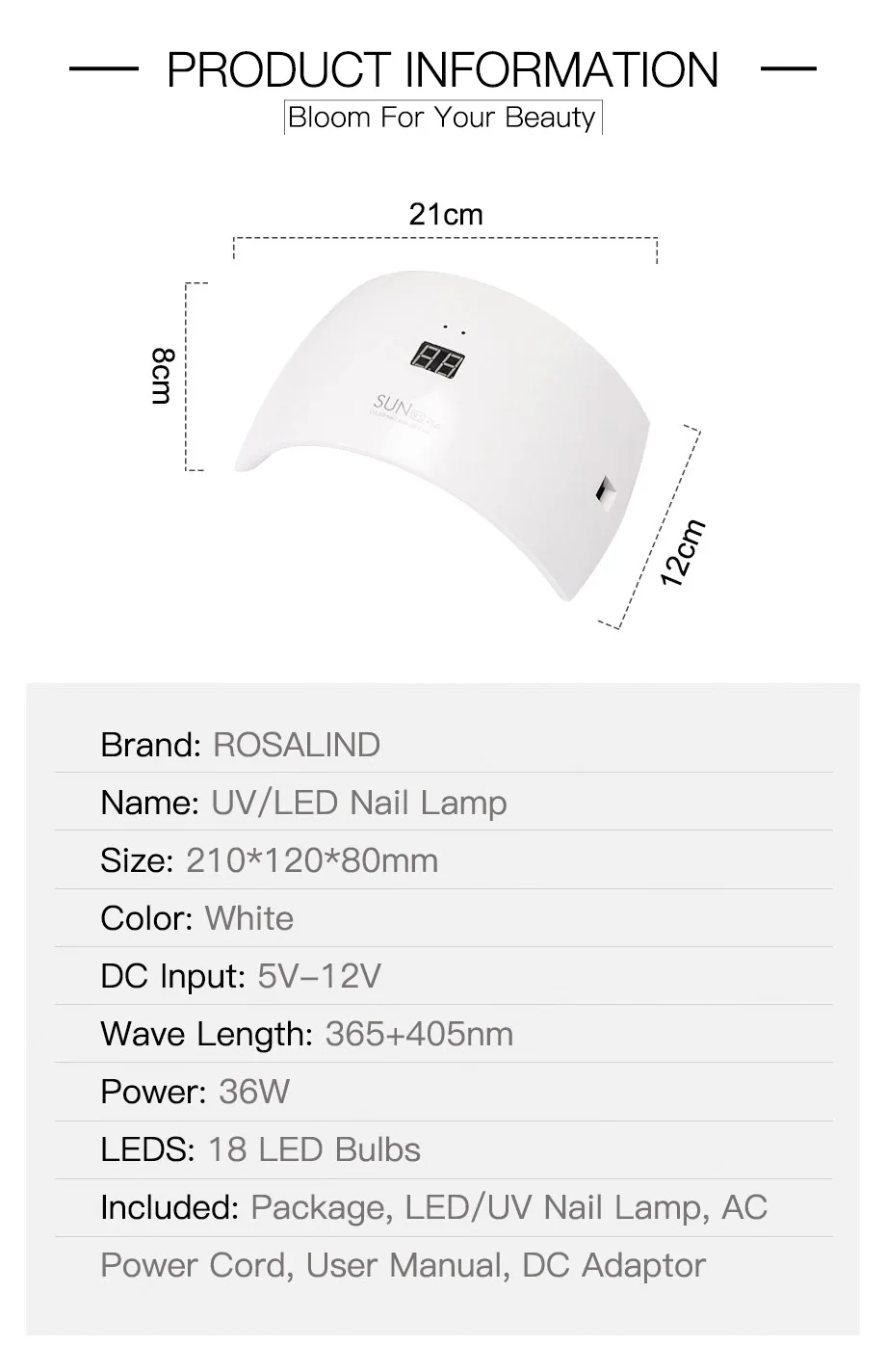 ROSALIND маникюрный набор, инструмент для ногтей, профессиональный набор для набор гель-лаков для ногтей, маникюра, 36 Вт, УФ светодиодный, сушильная лампа, базовый комплект верхней одежды