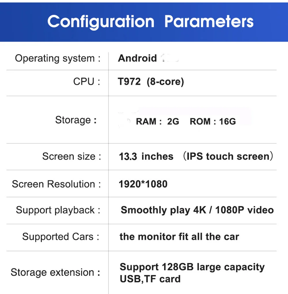 Отзывы о 13.3 Inch Android 2GB+16GB Car Headrest Monitor 4K 1080P Touch Screen WIFI/Bluetooth/USB/SD/HDMI/FM/Mirror Link/Miracast - купить по
