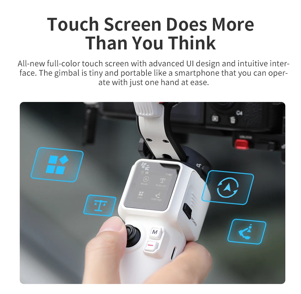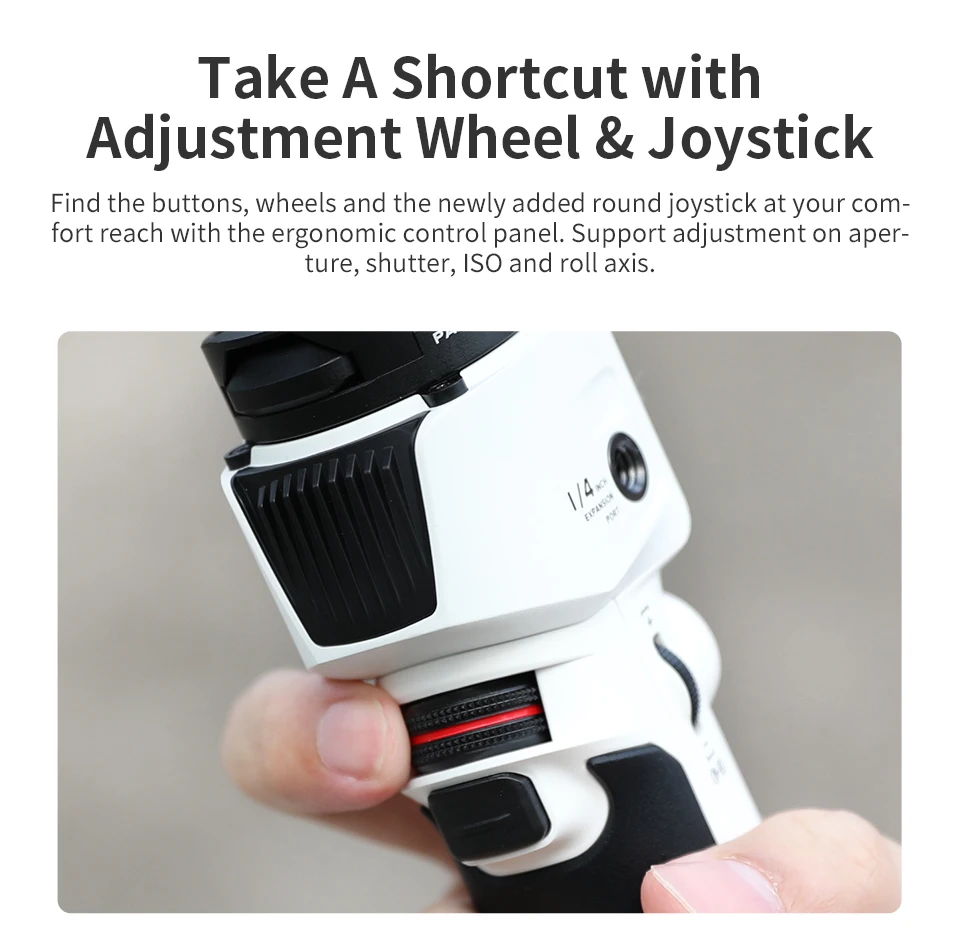 4.【1.22” Touch Screen & Ergonomic Control Panel for Friendly Operation】All-new touch screen with advanced UI design and intuitive interface. The gimbal is tiny and portable like a smartphone that you can operate with just one hand at ease. Supports Chinese/English menu; Find the buttons, wheels and the newly added round joystick at your comfort reach with the ergonomic control panel, support adjustment on aperture, shutter, ISO and roll axis.