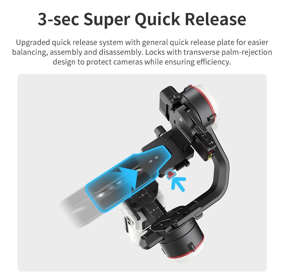 2.【Quick Release 4.0】Upgraded 3-sec super quick release system with general quick release plate for easier balancing, assembly and disassembly. Locks with transverse palm-rejection design to protect cameras while ensuring efficiency.