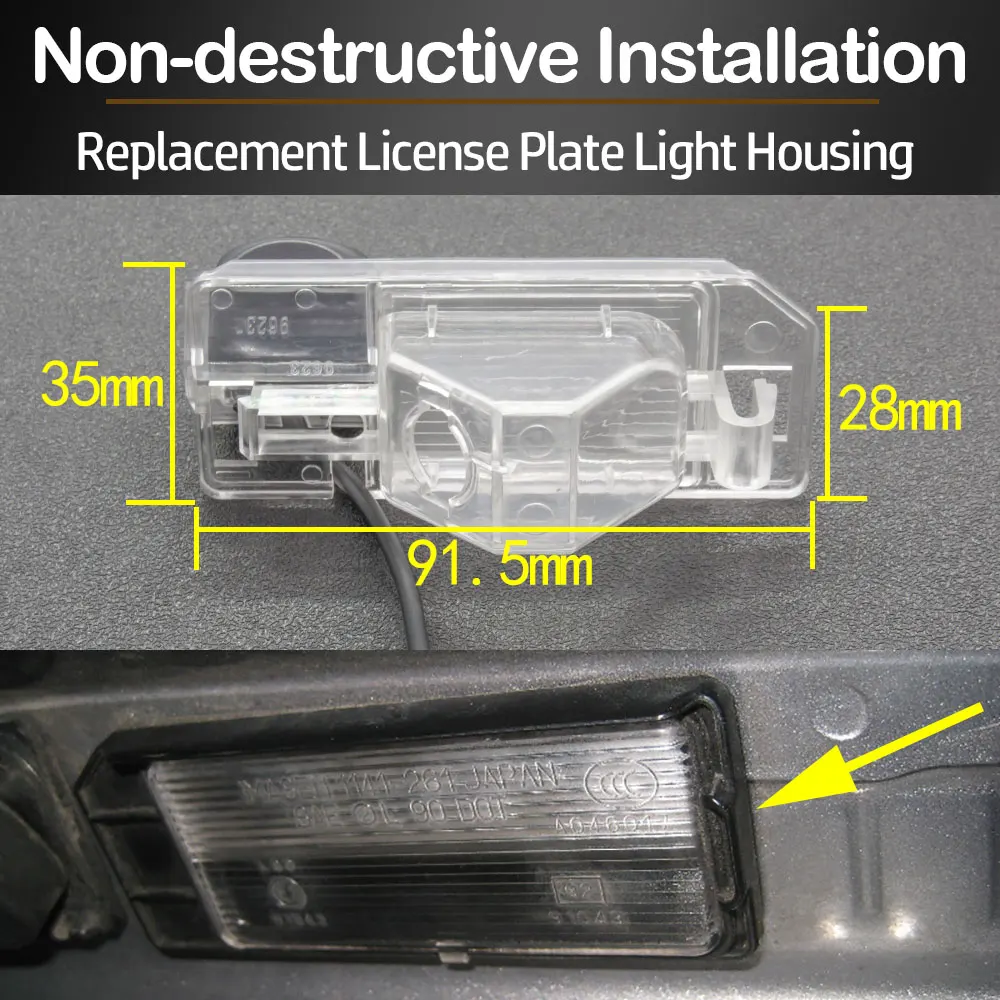 Эта камера устанавливается в положении корпуса номерного знака светильник, который может осуществить неразрушающую установку. Пожалуйста, подтвердите, что размер и внешний вид номерной знак светильник корпус соответствует размеру и форма кронштейн для камеры.