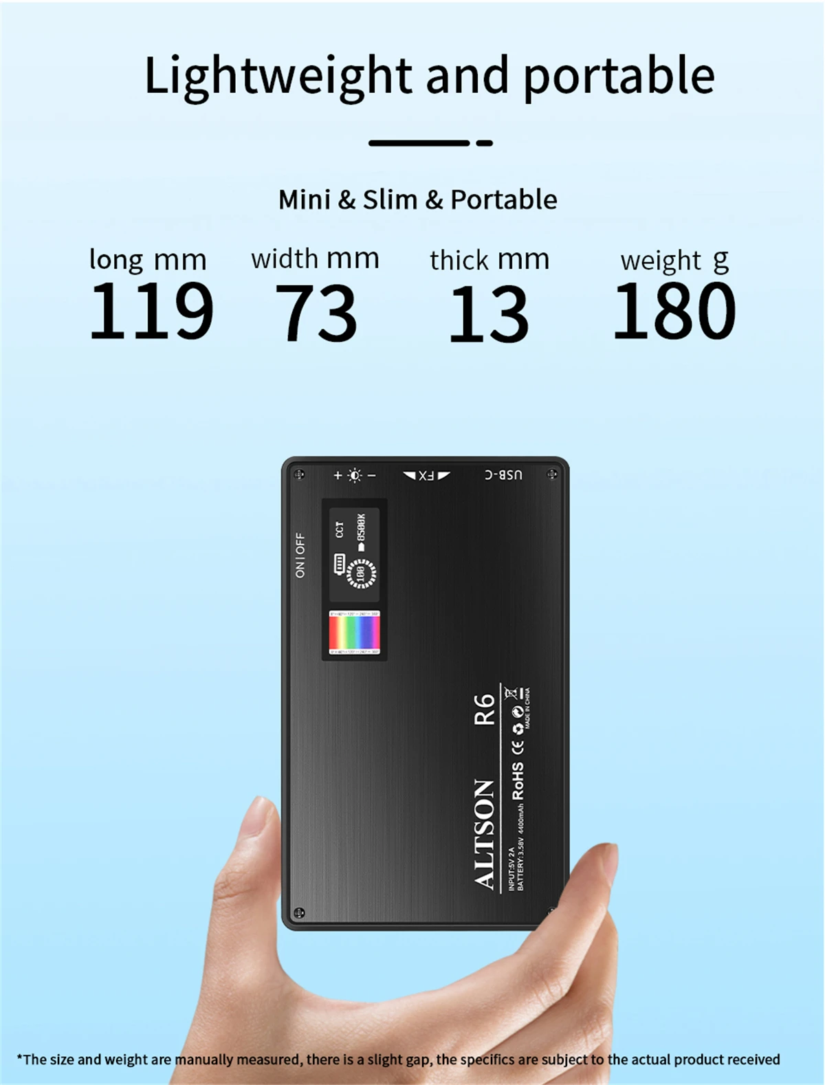 3. Общий дизайн фотографического светильник-светильник вес, тонкий и портативный, простой и изящный круглый вырез сделают вас более с помощью авиационного алюминия, с гладкой поверхностью, прочный и wear‑resistant, и очень удобно носить с собой, И может быть использован, когда вы вынимаете его.