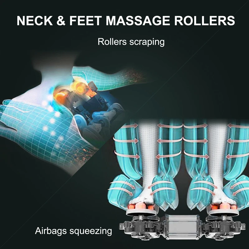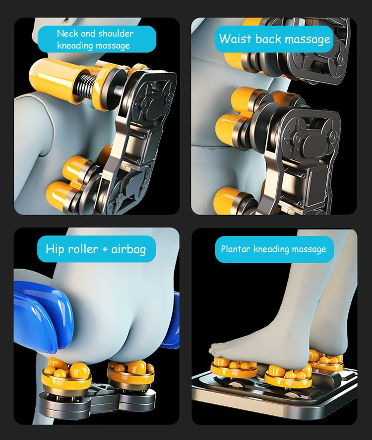 Есть shitasu, подушка безопасности, разминание, прокатка, тепло и музыка (синий зуб) и функции нулевой гравитации, позволяют наслаждаться всем расслабленным массажем тела;