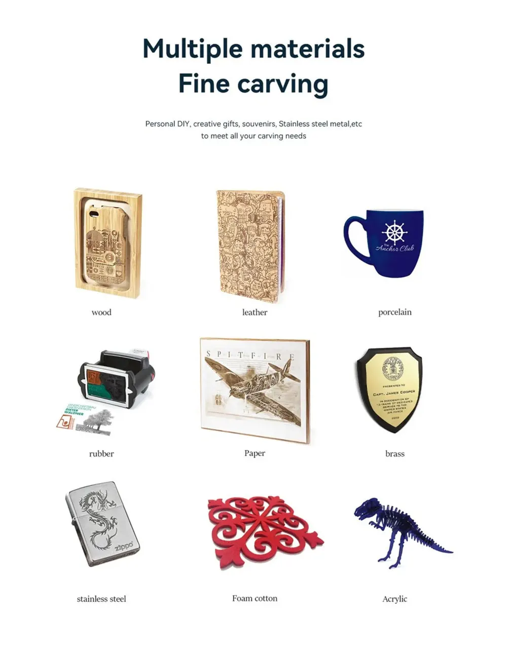 6. Новый модернизированный ультра-тонкий сжатия лазера: лазер принимает 4 раза группы линз коллизацией и технология фокуса, оптическая мощность составляет 4,5 ~ 5,5 W лазер основное направление сведена к 0.02mm м², лазер высокой плотности может легко отрезать 10 мм толстые деревянные доски и 6-8 мм черный акрил; Может непосредственно гравировать зеркало из нержавеющей стали металла и керамики.