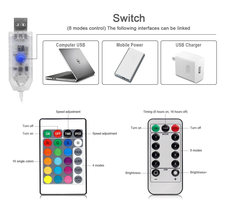 Переключатель 8 режимов: на USB или пульте дистанционного управления