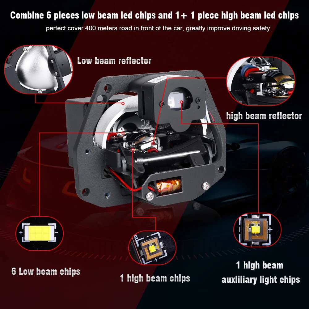Расстояние облучения 400 м: Дальний свет включает 1 светодиодную чипу и 1 вспомогательную микросхему, с линзой для проектора hyperboloid, часть дальнего света толще, выходной светильник четкий и концентрированный. Такая конструкция увеличит расстояние облучения дальнего света.