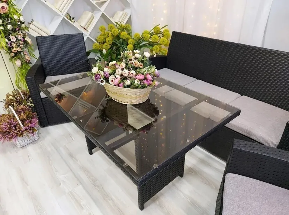 Набор садовой мебели-привлекательный Многофункциональный комплект с трехместным удобным диваном и полноценным большим столом, комплект будет отлично смотреться как снаружи, так и внутри дома. Комплект состоит из двух просторных кресел с широкими подлокотниками, дивана и стола. Основой дизайна набора является прочная металлическая рама, которая выдерживает до 150 кг за штуку. Ручной Искусственный ротанг является экологически чистым материалом с повышенной прочностью. Набор можно безопасно оставить на открытом воздухе в любую погоду.