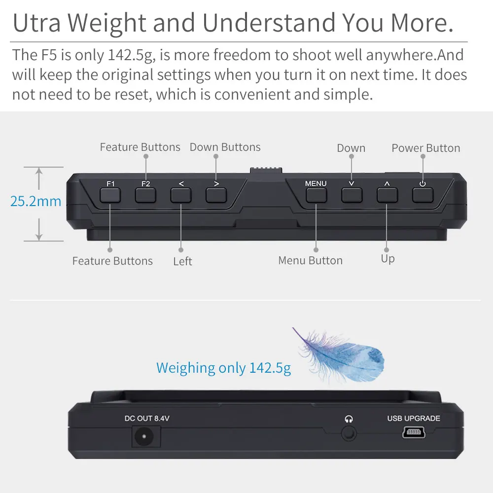 Конструкция всего монитора прочная и компактная, что позволяет легко установить его на камеру DSLR или даже на Стабилизатор карданного шарнира. Небольшой форм-фактор и легкая конструкция идеально подходят для стрелков на ходу и для тех, кто снимает в многолюдных местах, таких как шоу событий. F5 всего 5 дюймов и 142,5 г, очень легкий. Это дает вам свободу снимать хорошо в любом месте.