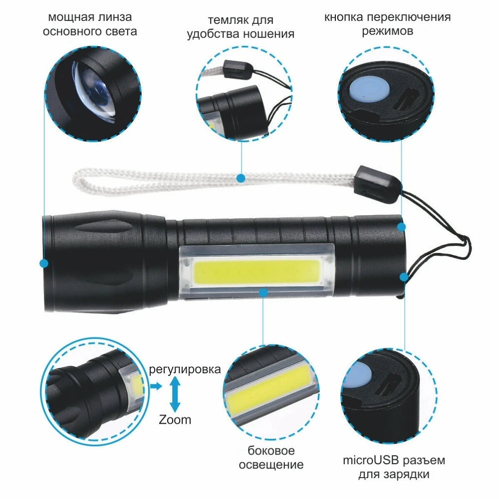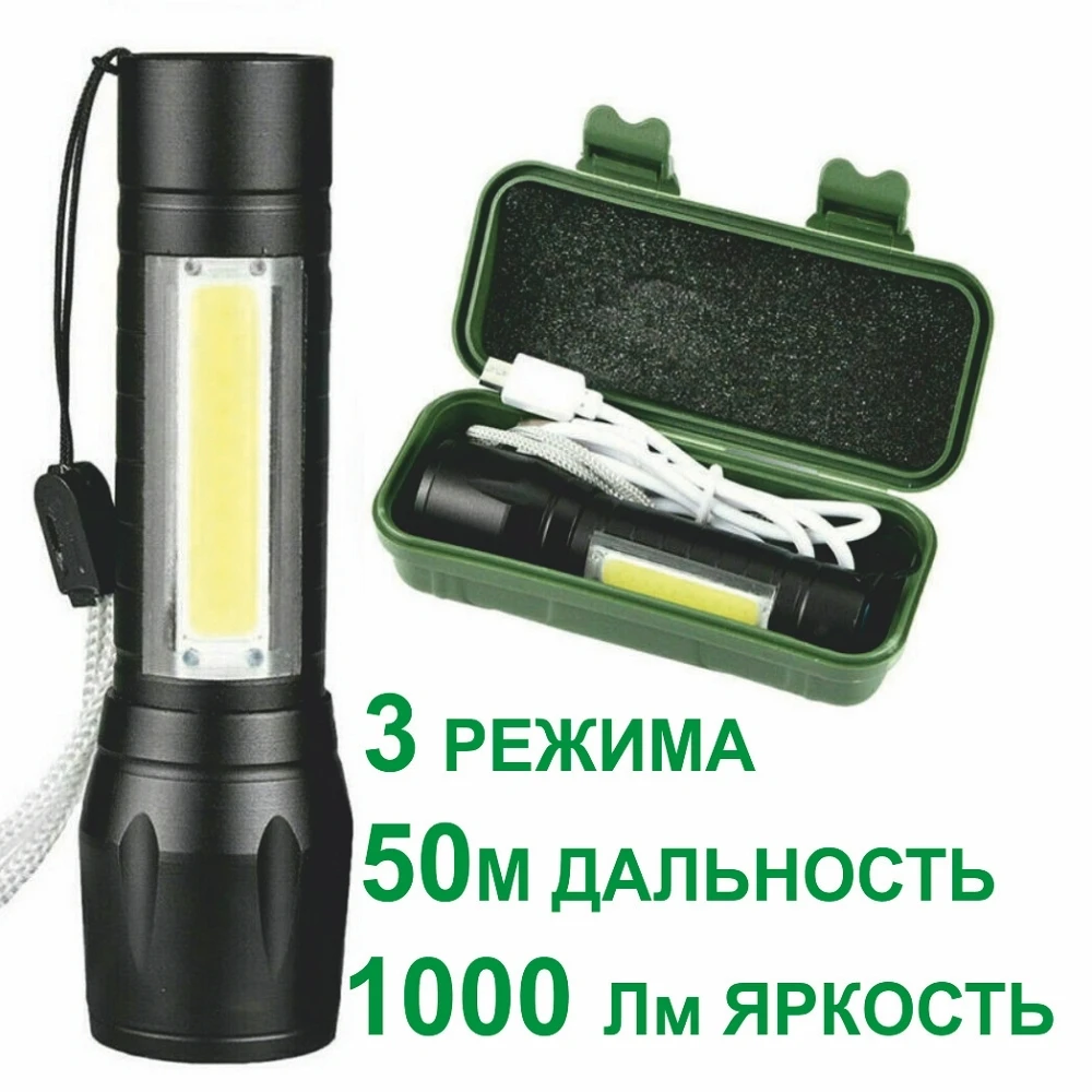 Отзывы о Фонарик ручной светодиодный аккумуляторный USB Charge XPE + COB в кейсе фонарь