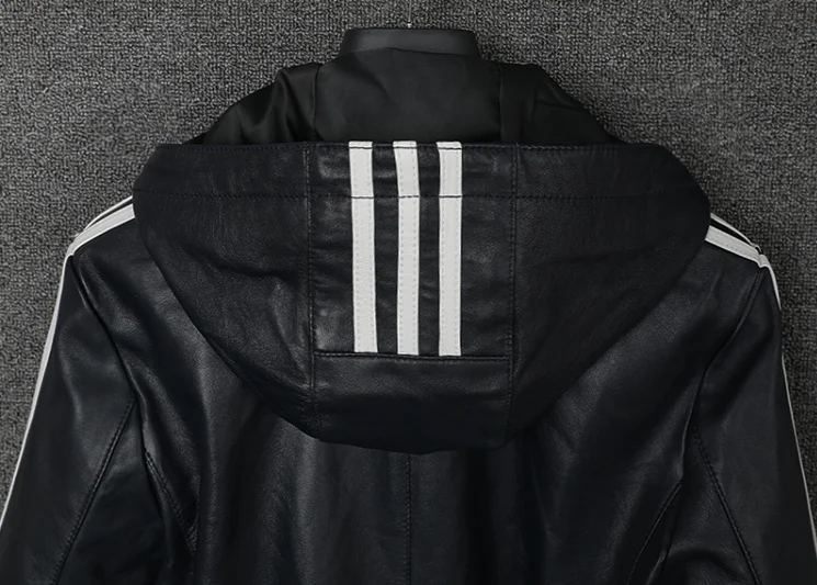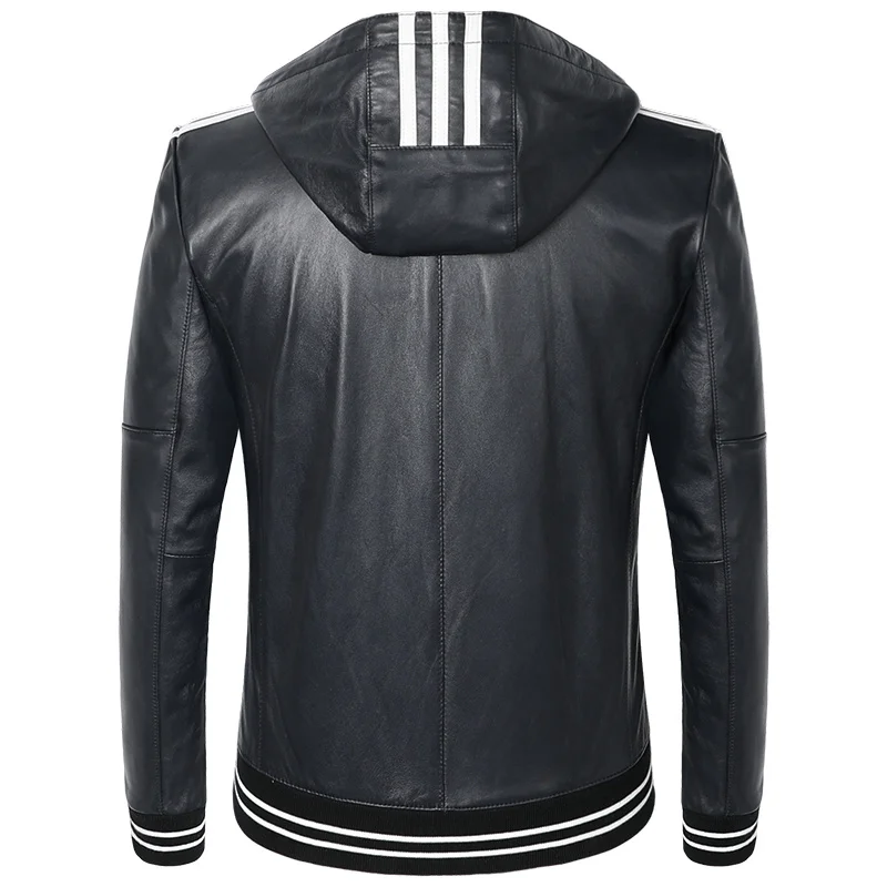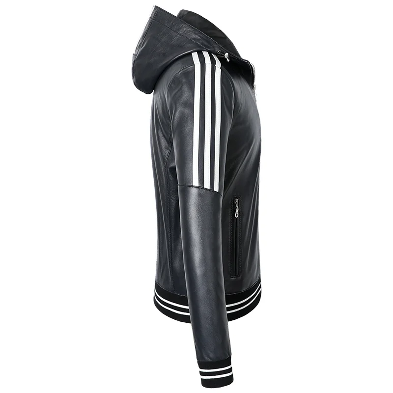 Модная мужская куртка из натуральной кожи с капюшоном из овечьей кожи в белую полоску; Куртки из натуральной кожи; Темно-синее пальто с капюшоном; Сезон весна-осень; S-3XL