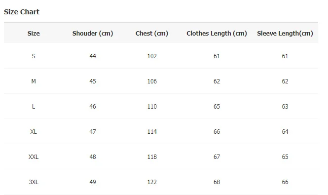 Пожалуйста, внимательно проверьте таблицу размеров перед покупкой. Или сообщите мне ваш вес и рост, мы предоставим вам правильный размер, спасибо! Размер измеряется плиткой одежды, а не телом. Дружеское Примечание: 1. Таблица размеров выше относится к размерам одежды, а не к измерениям вашего тела. 2. Если у вас есть какие-либо вопросы о размере, дизайне и т. д. пожалуйста, свяжитесь с нами перед тем, как сделать ставку. Мы будем очень рады Вам помочь. 3. Если ваши измерения между двумя размерами, пожалуйста, выберите следующий больший. 4. Из-за ручного измерения возможна погрешность в 1-2 см.