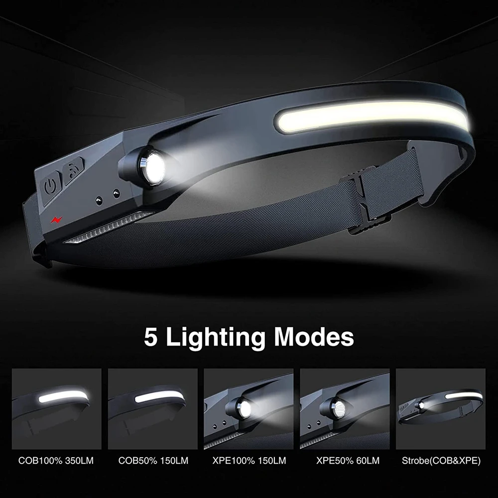 Selling point four: [5 lighting modes]: LED headlights can meet various lighting needs. It has 5 lighting modes: front light COB strong light, front light COB low light, side light XPE strong light, side light XPE low light
