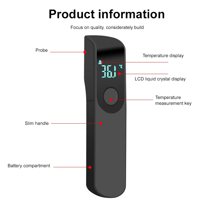 1. Практичный: предназначен для измерения температуры лба человеческого тела, а температура окружающей среды и температура лба динамически компенсируются.