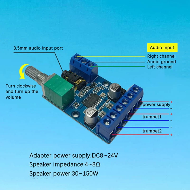 1, рекомендуется источника питания постоянного напряжения 8-24V более 26V, чип будет гореть вниз, ниже 8V будет шум.