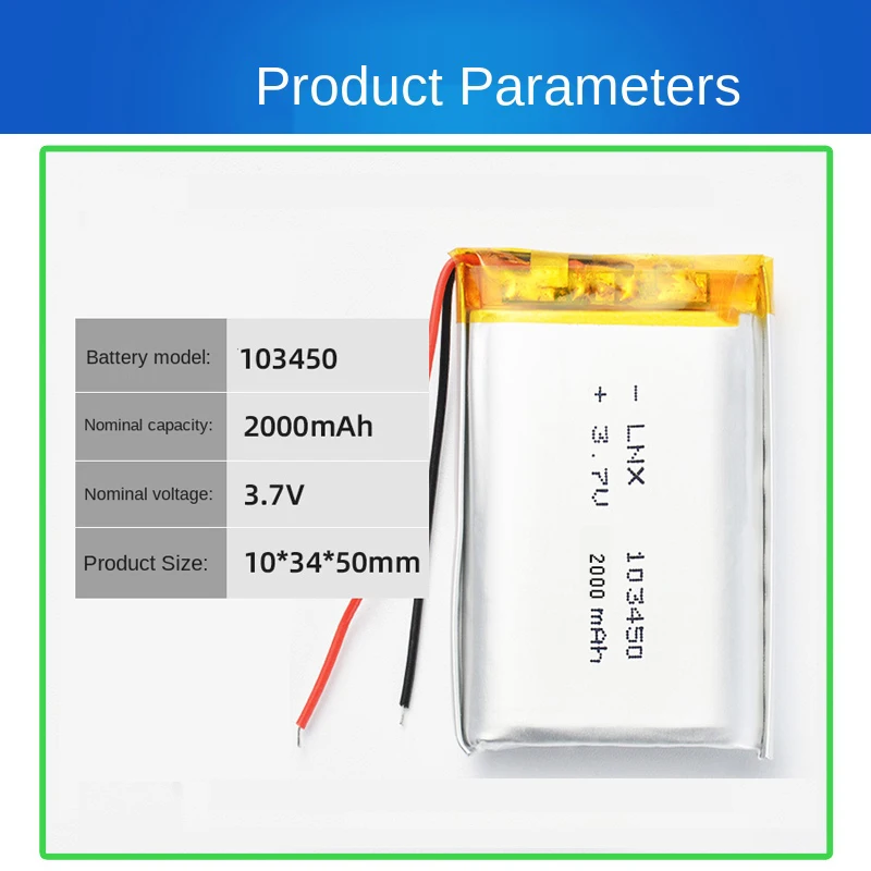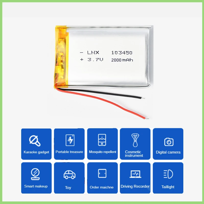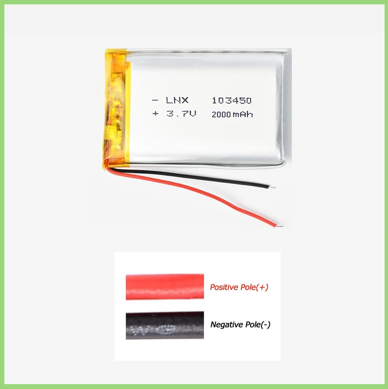 103450 3,7 V, 2000mAh аккумуляторная батарея Li-Po.Встроенный интеллектуальный защитный модуль для зарядки печатных плат, эффективно предотвращает чрезмерную зарядку, разрядку, перегрузки по току, короткое замыкание.