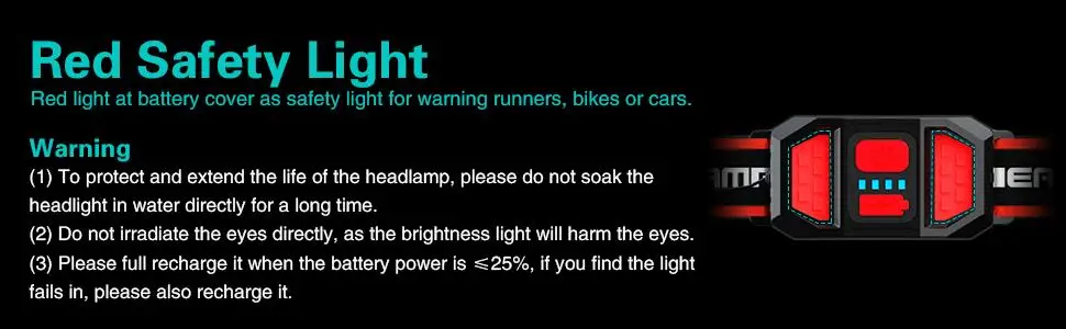 【 3 режима освещения и Hands-Free】Эта перезаряжаемая фара имеет высокий и низкий и стробоскопический светильник. Задний красный светильник безопасности для предупреждающих бегунов, велосипедов или автомобилей. Простой в использовании, просто нажмите красную кнопку на Батарейный отсек: фара и красный индикатор безопасности хвост светильник будет светильник в одно и то же время. Светодиодный оголовье-светильник Hands free идеально подходит для инспекторов, ремонтников, автомехаников, домовладельцев и ремесленников. Благодаря этой отличной фары вы почувствуете невиданное чувство безопасности в темноте.