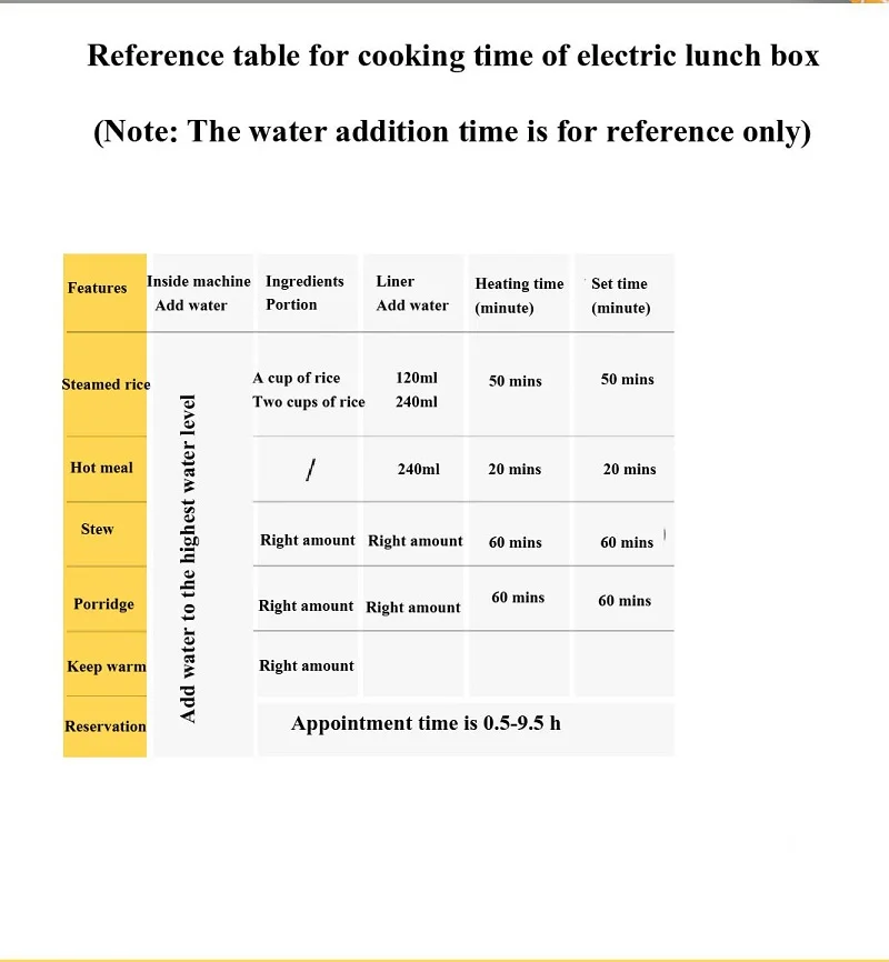 Функция: горячий рис, пару риса, тушеный суп, конджи, яйцо на пару, десерт, сохранение тепла