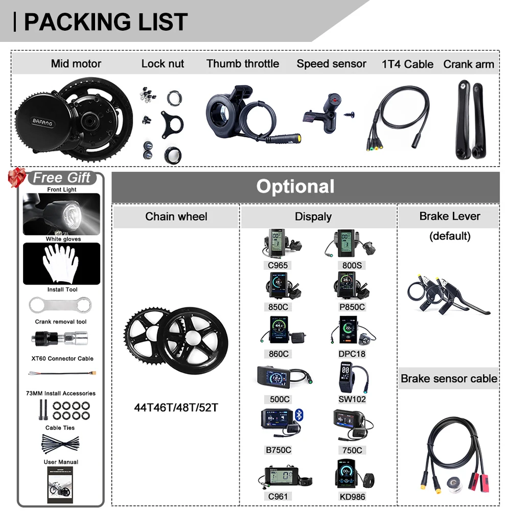 В комплект входит:1*36V 250W Средний привод двигателя1 пара * тормозной рычаг или Датчик тормоза1 пара * рукоятка1 пара * цепное колесо(Вариант 44T/46T/48T/52T, пожалуйста, оставьте нам сообщение, если вы хотите изменить колесо цепи)1 комплект * дроссельная заслонка большого пальца1 комплект * Датчик скорости1 * дисплей (DPC181 Bluetooth, 750C bluetooth, DPC18, KD986, 860C, P850C, 850C, 750C, SW102, 500C, 800S, C961 вариант)1*4 в 1 кабель1 * аксессуарыПодарки: 1 шт. 6 в передний светильник + 1 шт. перчатки + 1 шт. ключ для установки инструмента + 1 шт. съемный инструмент для кривошипа + 1 шт. XT60 порт Соединительный кабель для аккумулятора + 1 комплект * Установка аксессуаров для нижнего кронштейна 73 мм + Кабельные стяжки + руководство пользователя