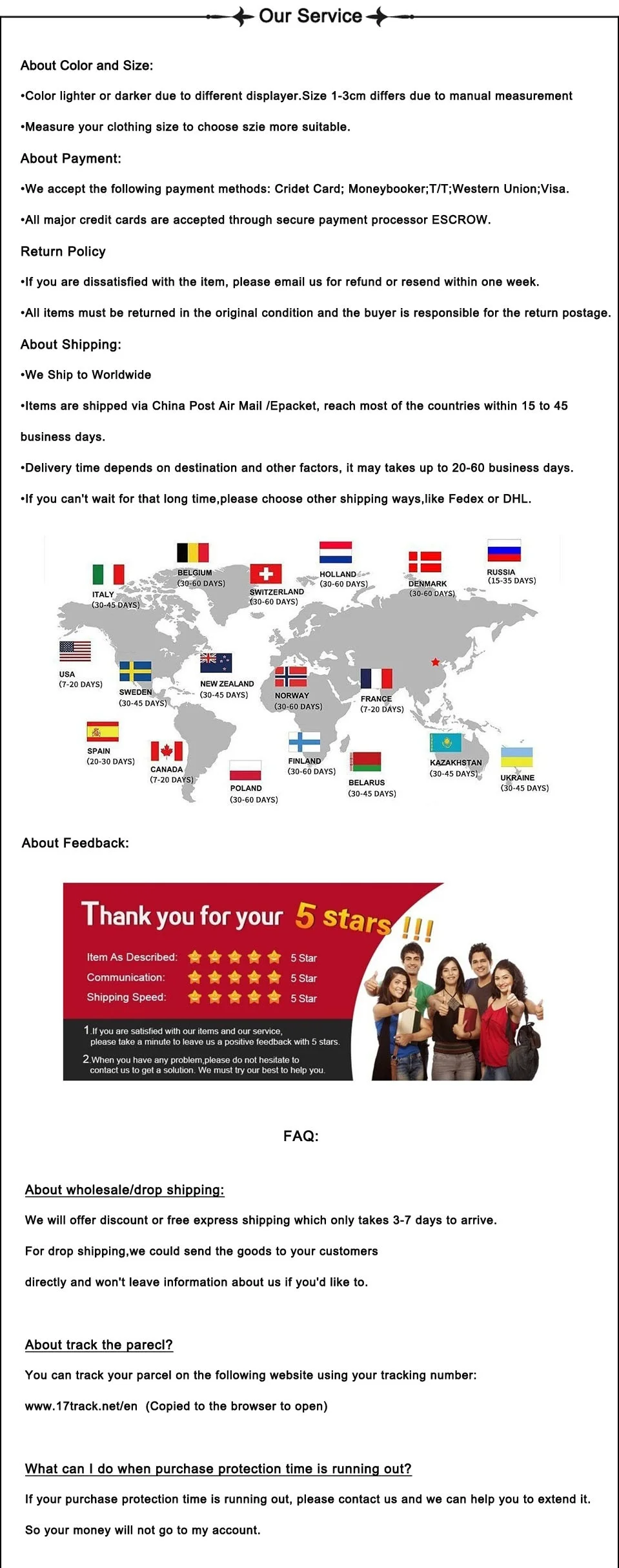 Мы принимаем Alipay, West Union, TT. Все основные типы кредитных карт принимаются через защищенную систему оплаты ESCROW.