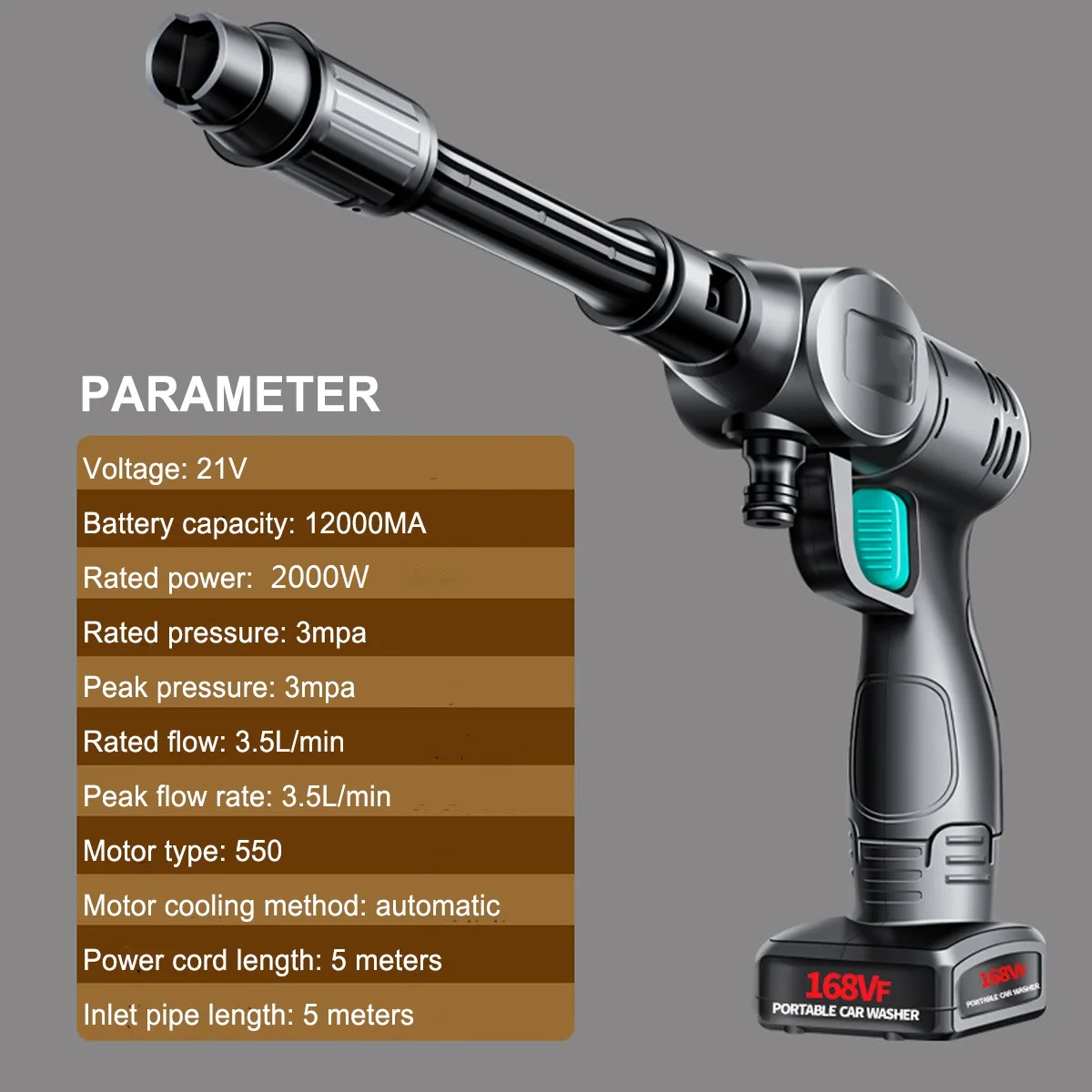 Посылка включает: Комплект 1:1 батарея ● 1 пистолет для мойки под давлением ● Аккумулятор-1 шт. ● 1 x Регулируемый длинный наконечник для пистолета ● Быстрый разъем-1 шт. ● 1 х Водопровод ● Зарядное устройство-1 шт. ● Фильтр-1 шт. ● Разъем для бутылки-1 шт. ● 1 х пенопласт Комплект 2: 2 батареи ● 1 пистолет для мойки под давлением ● 2 батарейки ● 1 x Регулируемый длинный наконечник для пистолета ● Быстрый разъем-1 шт. ● 1 х Водопровод ● Зарядное устройство-1 шт. ● Фильтр-1 шт. ● 1 х разъем для бутылки колы ● Пена-1 шт. Комплект 3: без батарей ● 1 пистолет для мойки под давлением ● 1 x Регулируемый длинный наконечник для пистолета ● Быстрый разъем-1 шт. ● 1 х Водопровод ● Зарядное устройство-1 шт. ● Фильтр-1 шт. ● 1 х разъем для бутылки колы ● Пена-1 шт. Описание товара Материал: нейлон Напряжение: 21 в Емкость аккумулятора: 12000 мА Срок службы: около 30 минут Номинальная мощность: 2000 Вт Номинальное давление: 3 МПа Пиковое давление: 3 МПа Номинальный поток: 3,5л/мин Пиковый расход: 3,5л/мин Тип двигателя: 550 Метод охлаждения двигателя: автоматическое охлаждение Длина шнура питания: 5 метров Длина впускной трубы: 5 метров Столб из нержавеющей стали: 15,5 см Диаметр впускной трубы: 7,5 см Выход: 1,3 см Емкость для пены: 200 мл Размер корпуса: 20x15 см