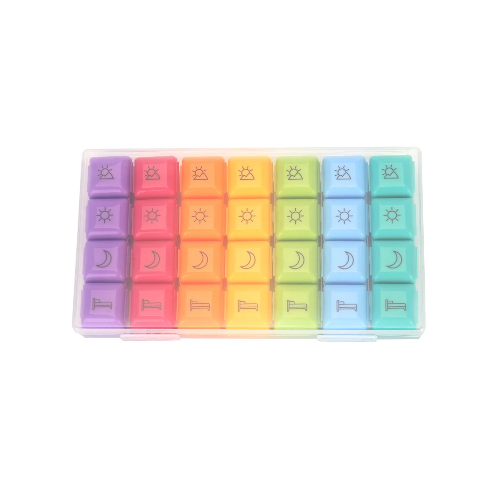 Имеет 28 ячеек с отдельнми крышками. Рассчитана на неделю при приеме лекарств 4 раза в сутки. Таблетница поместится даже в небольшой сумке.