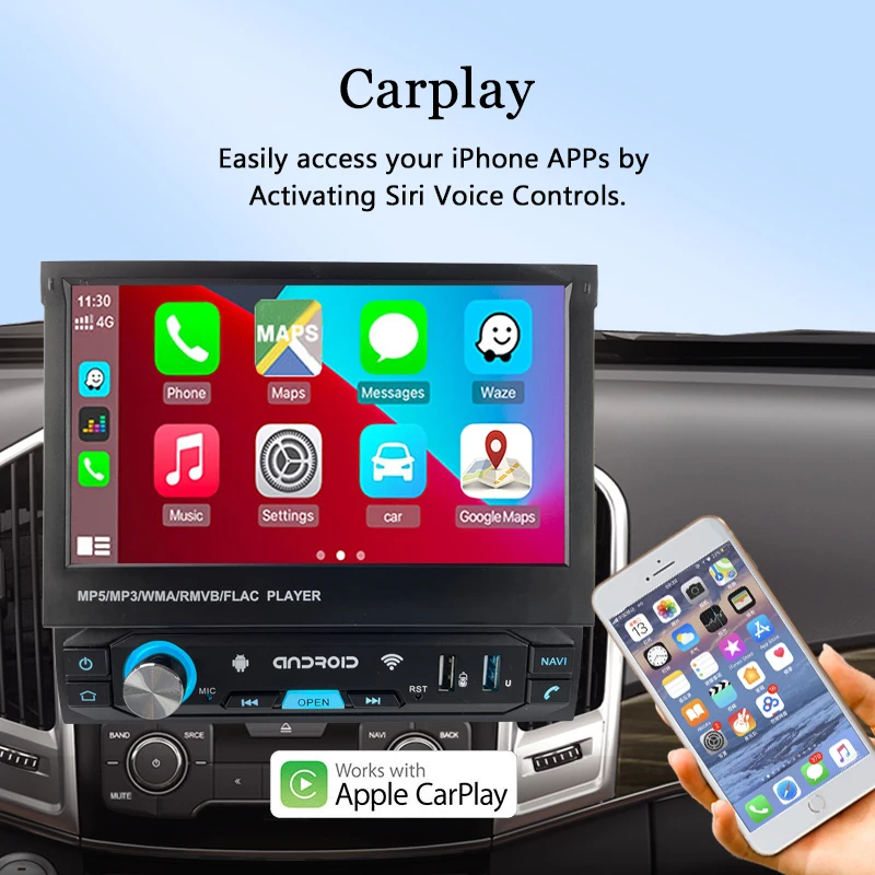 4. Встроенный CARPLAY: при подключении к iPhone, даже если ваш телефон находится в спящем режиме, радио mp5 по-прежнему может работать с любым приложением на вашем iPhone, таким как телефон без рук, GPS, это поможет вам сэкономить больше заряда батареи, это действительно потрясающе!