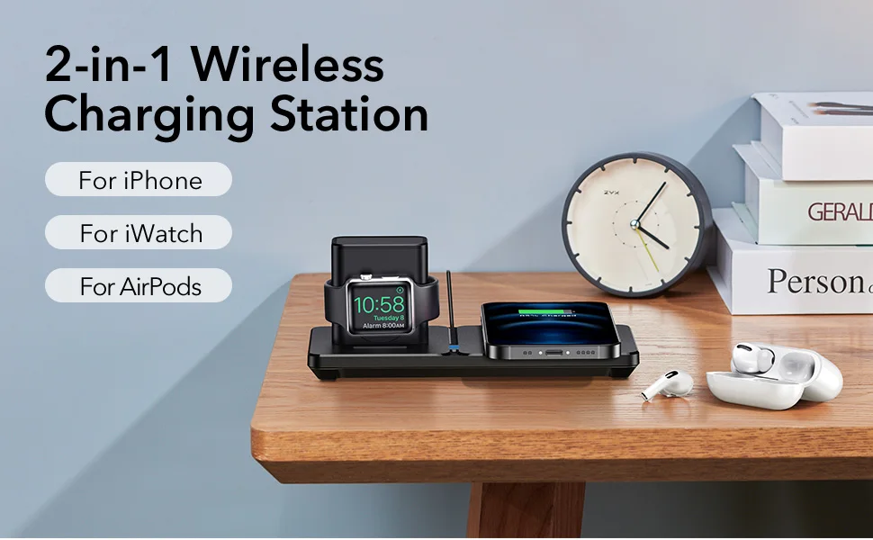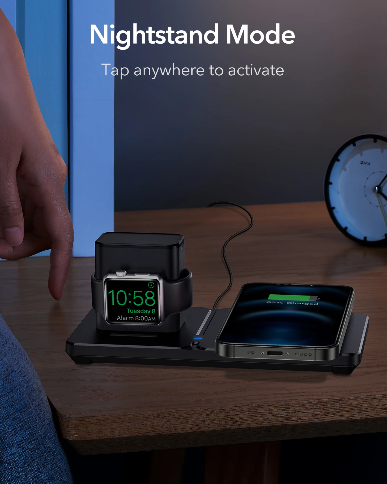 Заряжает iWatch и iPhone/AirPods одновременно, сохраняя ваш стол аккуратным и экономя ценное пространство.