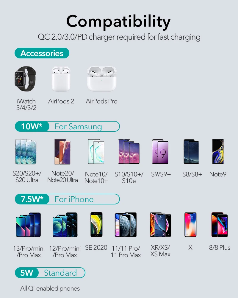 Совместимость со всеми устройствами с поддержкой Qi iOS и Android. Поддерживает 10 Вт быстрой зарядки для Galaxy S20/S10; 7,5 Вт быстрой зарядки для iPhone SE/11/XR/8 Plus, iPhone 5 Вт для AirPods 2/AirPods Pro & Galaxy бутоны; 3 Вт для iWatch 5/4/3/2.
