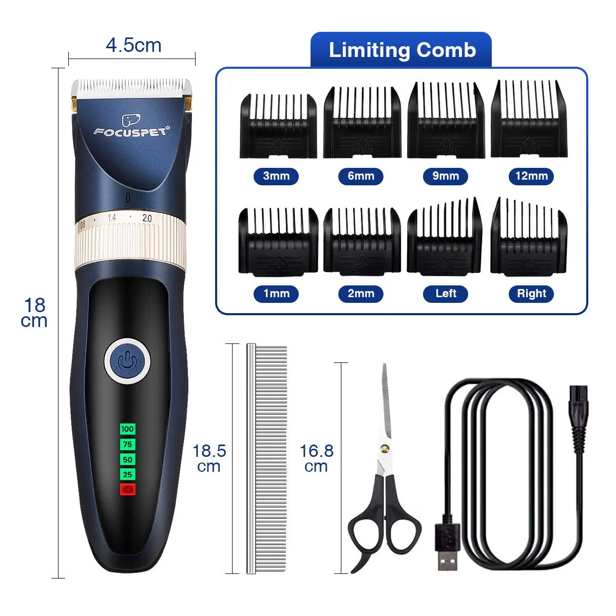 Регулируемые лезвия и 8 сменных направляющих расчесок-триммер для волос для животных с 1 мм/2 мм/3 мм/6 мм/9 мм/12 мм/влево/вправо восемь различных размеров направляющих расчесок, делает его более безопасным, простым в использовании, подходит для различной длины волос животных. И лезвие расстояние в передней части может быть набор для 0,8 мм-2,0 мм 5 виды длины.