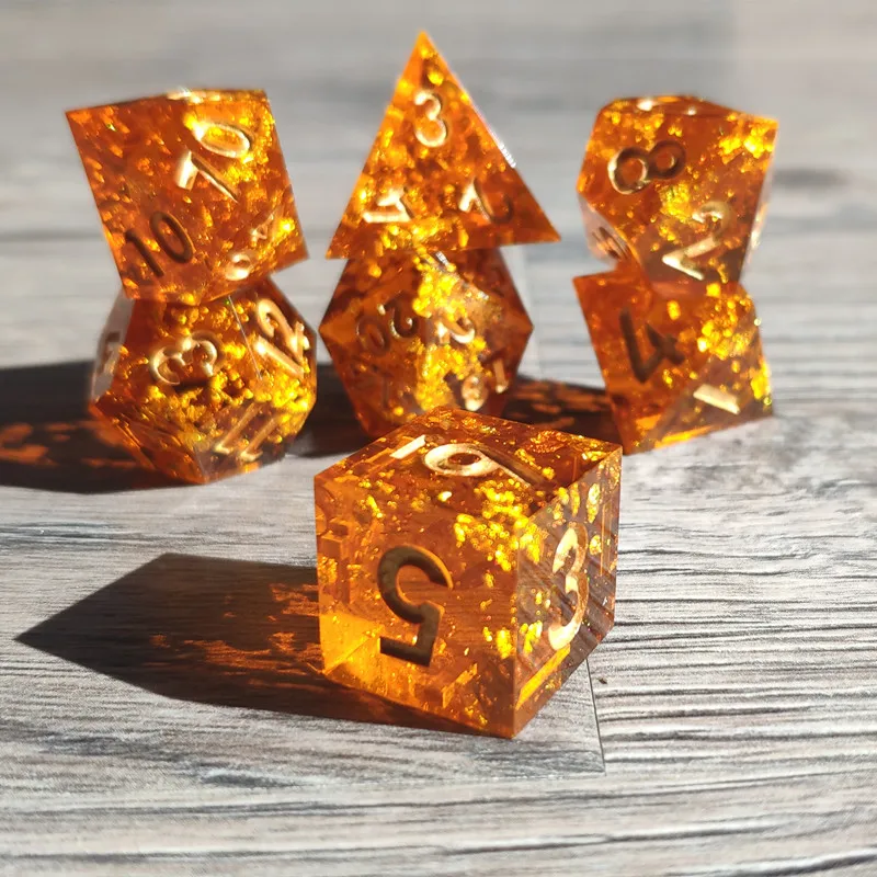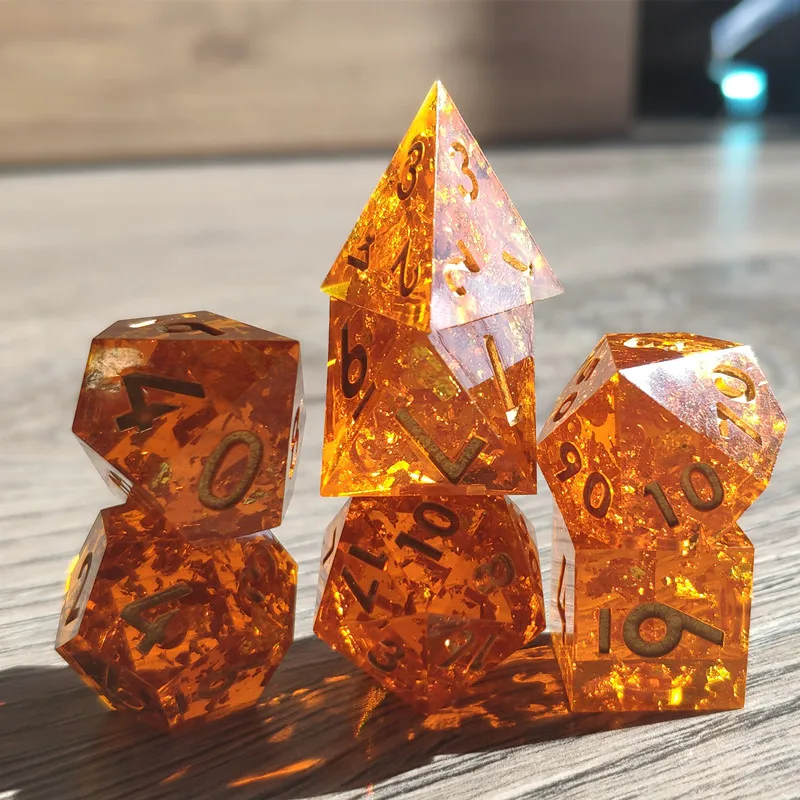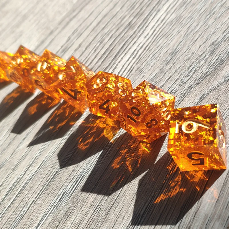Эти игральные кости DND набор содержит один D4, один D6, один D8, один D10, один D %, один D12 и один D20. каждый острый смолы кости отполированы вручную, чтобы сохранить свои красивые острые края, И красивый блеск впрыскивается в кости. Многопроизводственная ручная полировка для достижения строгих размеров и стандартных форм.