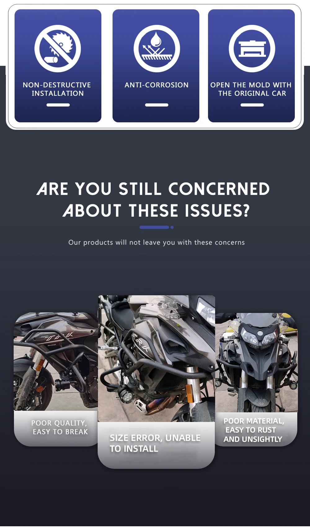 Эффективно защищает ваш мотоцикл, предотвращает повреждение двигателя вашего автомобиля, а также играет роль украшения вашего мотоцикла.