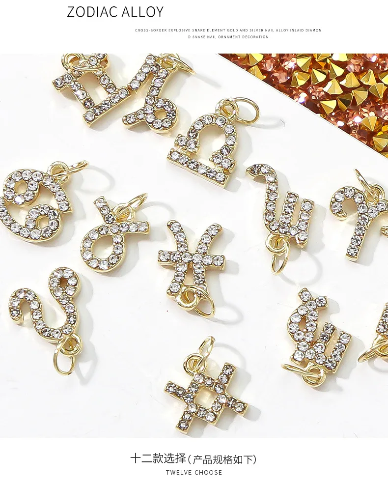 Подвески для ногтей, 12 шт., Зодиак, подвески для ногтей, сплав, 12 созвездий, подвески с блестками, стразы для украшения ногтей (золото)