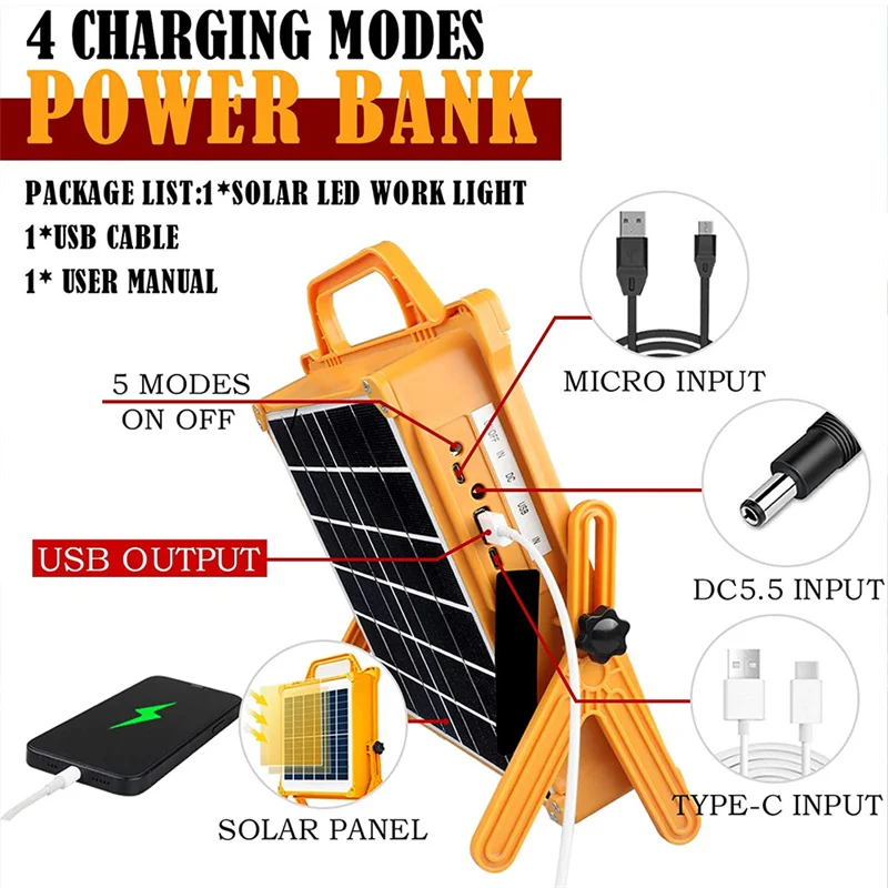 【Портативный перезаряжаемый Солнечный рабочий светильникВстроенный мобильный аккумулятор емкостью 11000 мАч, два порта для зарядки MICRO и TYPE-C, чтобы зарядить портативный солнечный рабочий светильник, в энергосберегающем режиме, он может обеспечить до 20 часов длинный светильник, в чрезвычайных ситуациях, он может обеспечить аварийное питание для мобильных телефонов или других мобильных устройств. Примечание! Поскольку мощность аккумулятора может быть низкой, пожалуйста, полностью зарядите перезаряжаемый светодиодный рабочий светильник перед использованием после получения товара!