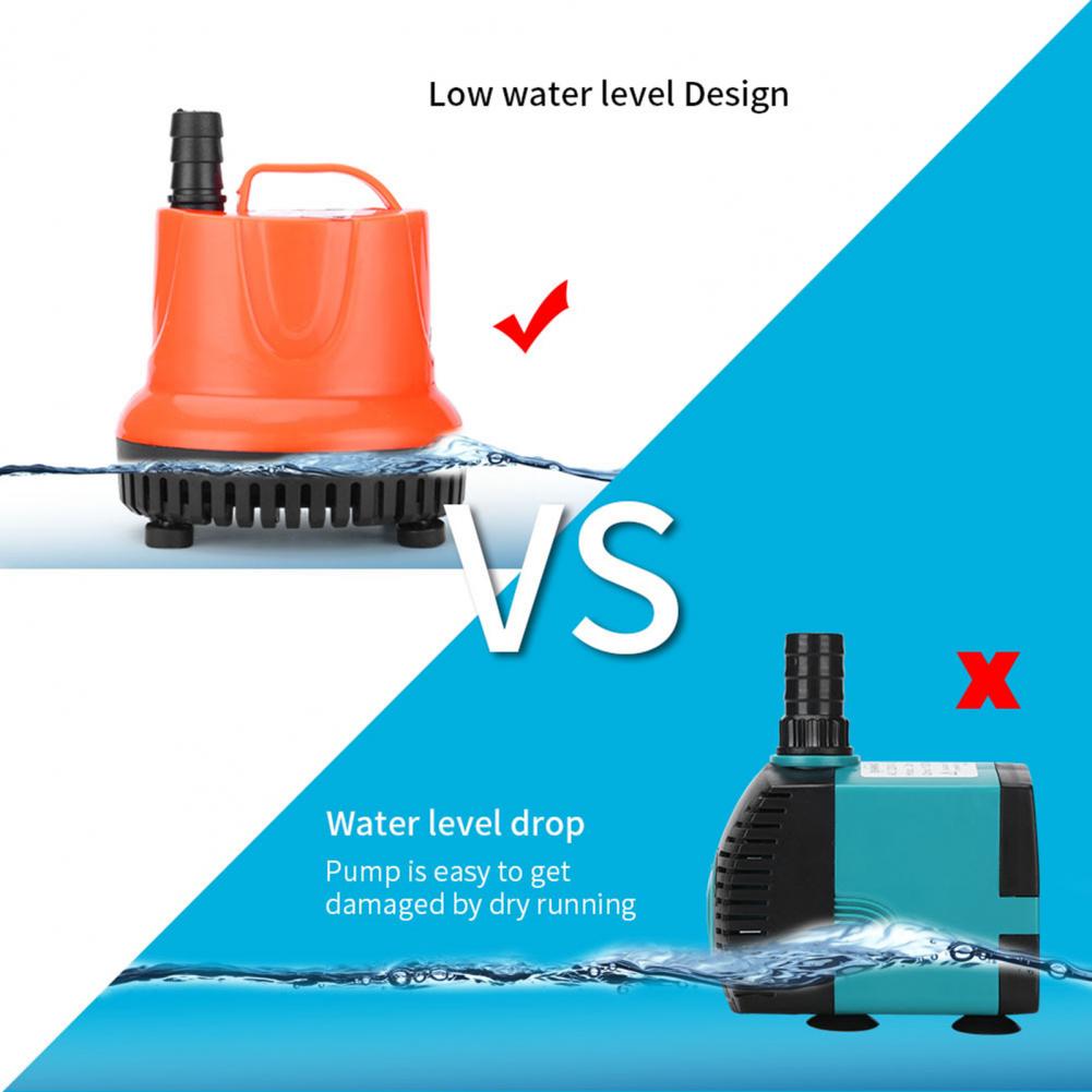 С характеристикой низкого уровня шума и шумоподавления, водяной насос может быть запущен на уровне воды 5 см, и он может быть ниже 1 см при перекачивании воды. Этот аквариумный насос легко держать благодаря удобной конструкции ручки.