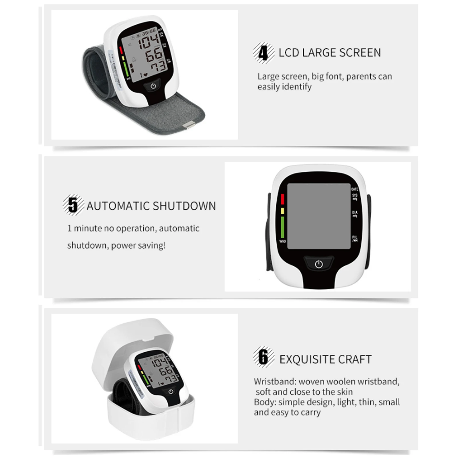 Большой экран, автоматическое выключение, интеллектуальное давление, импортные чипы, Голосовые объявления, измерение одним щелчком, нерегулярные импульсные wae подсказки.